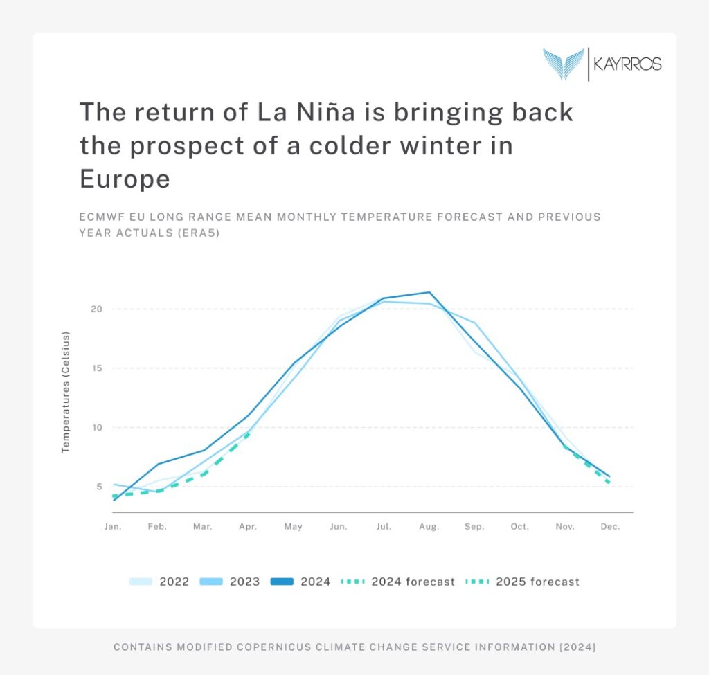 • On the demand side, Europe has already suffered multiple cold spells and low wind speeds since the start of winter. La Niña’s return means a strong chance of colder weather for the rest of the season than last year.