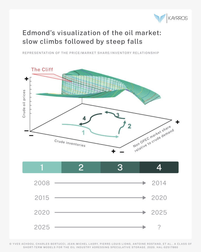 • For several months, Edmond had shown the market was itching for an exogenous shock that would cause a “cliff” formation.Trump’s “Liberation day” had all the hallmarks of such a trigger. Sure enough, OPEC responded by hiking supply.
