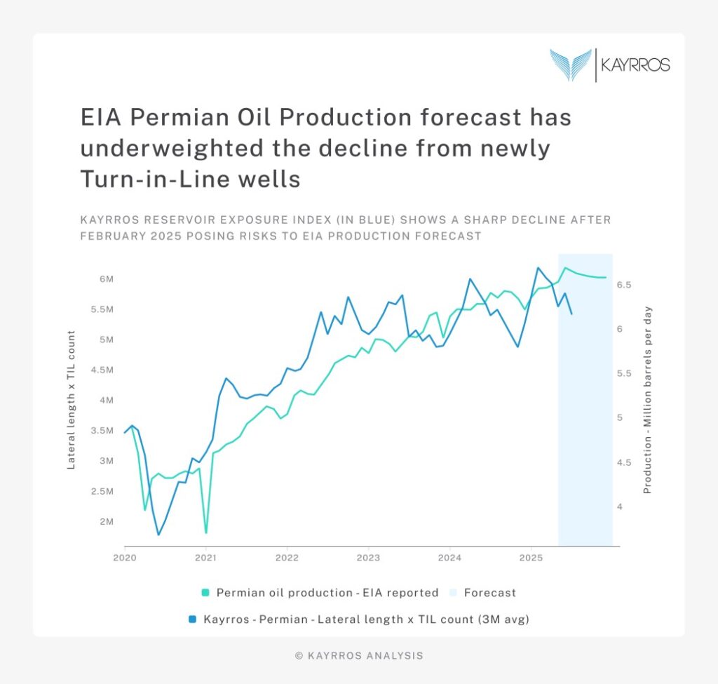 • Historically, similar declines have preceded basin-level output drops. Yet the U.S. EIA forecast still shows production holding flat through 2026, a view our data suggest may underestimate the actual slowdown.